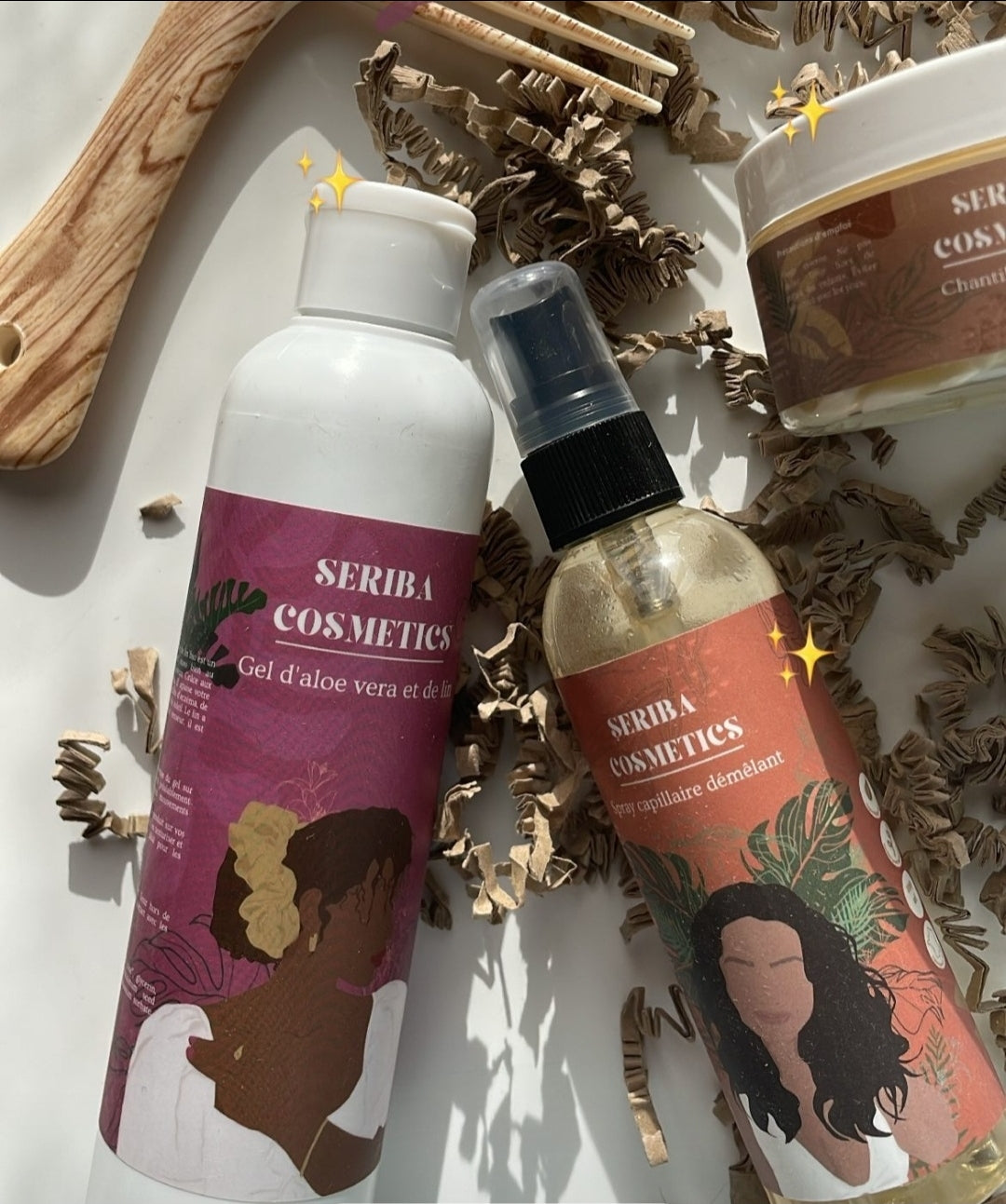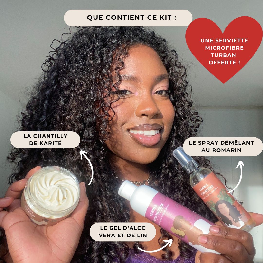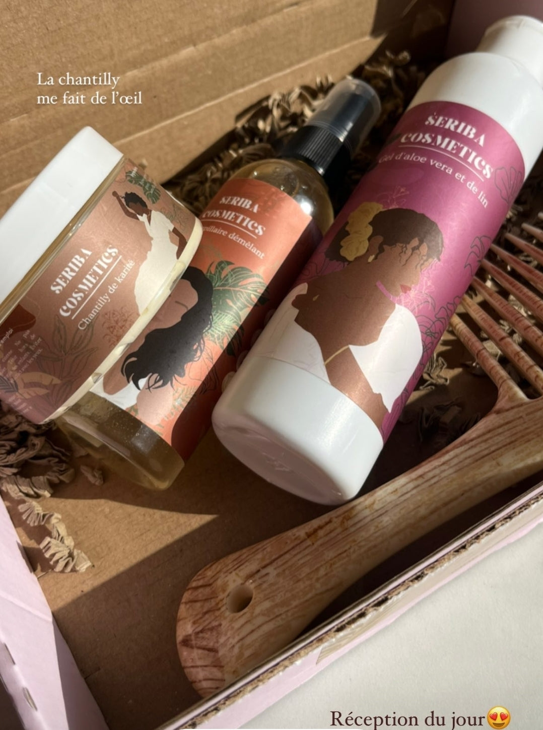D'un spray démêlant au romarin, un gel d'aloe vera et de lin qui hydrate et définies les boucles sans effet carton et enfin d'une chantilly de karité multifonction qui va sceller toute l'hydratation apportée précédemment